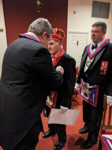 At the Stated Meeting of Catasaqua Chapter held on Oct 16th, 2023, DDGHP Brad R. Steigerwalt presented Comp. William M. Mason, III. with his 50-year service award. The DDGHP was assisted by the MEGHP in presenting Comp. Bill with his pin and certificate.