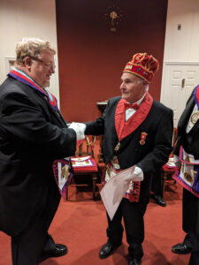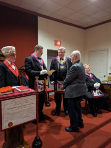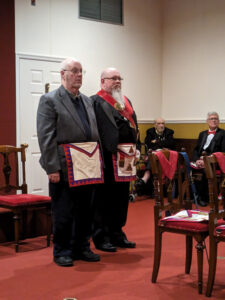 At the October 5th meeting of St. John’s Chapter No. 171, MEHP J. David McKibben presented Comp. Jeffrey R. Miller with his Past High Priest’s jewel. Comp. Miller served his Chapter as High Priest in 2022.